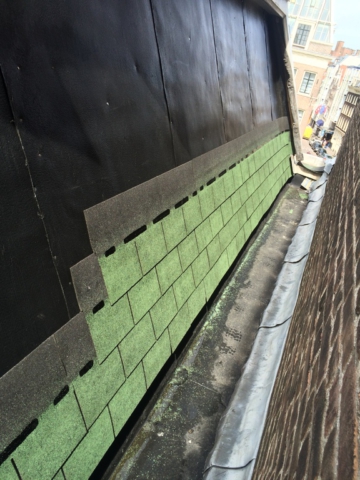 Bij een pand aan de Kloverniersburgwal te Amsterdam zijn we bezig met renovatie van diverse werkzaamheden. Zo hebben we de shingles langs het verticale dak vervangen, de zinken goot aan de voorzijde wordt vervangen. Voor onze veiligheid hebben we Kedge dakbeveiligingen bevestigd.